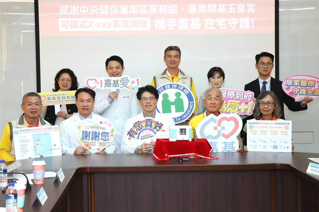 嘉義基督教醫院3日獲台南玉皇宮捐贈1台可攜式X光機,南區健保署業務組長林純美(前右1)、玉皇宮主委涂大松(前右2)及嘉基院長陳煒(前右3)等人出席見證。