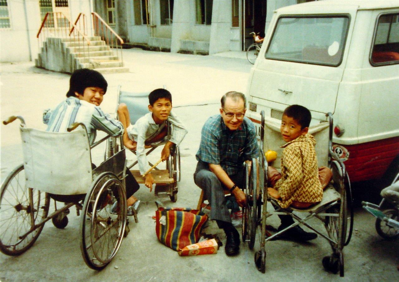 倪傑是嘉基第一位志工,大家都叫他「Uncle」。他特別關愛小兒麻痺的病童,除了心理關懷,也常挽起袖子為他們修理輪椅、輔具。