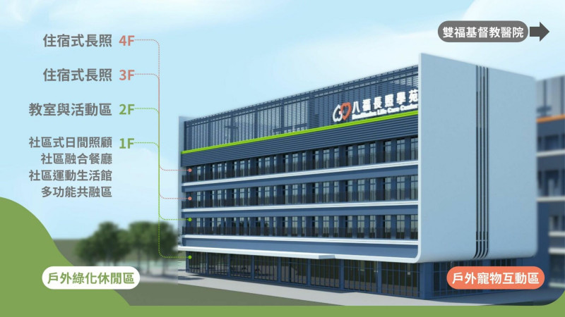 陳煒說,八福長照學苑與一般長照中心不同之處,乃結合「日間照顧」與57床「住宿式長照」等多元服務,讓大嘉義地區的家庭能依據生活特性與不同的健康需求,選擇更適切的服務方案;其中也規劃大齡食堂、運動中心、多元共融共學空間、戶外綠化休閒區與寵物互動區等,兼顧關照長者及家屬的身心靈療癒。