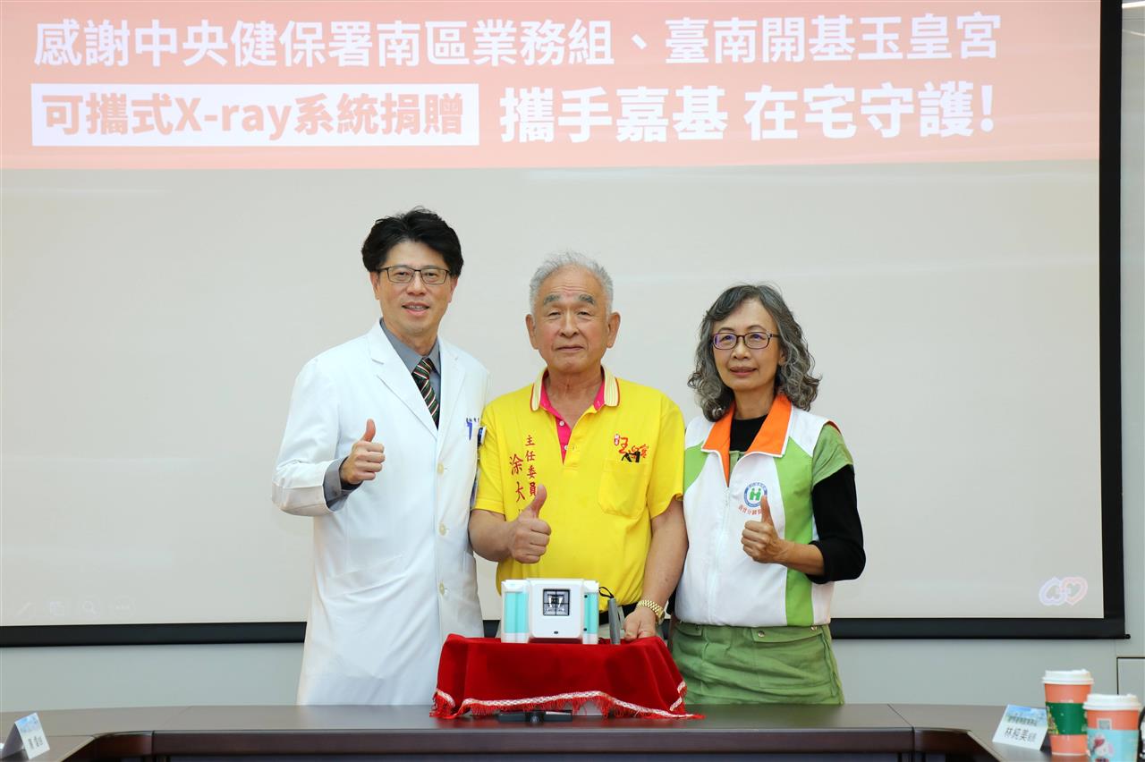 嘉義基督教醫院3日獲台南玉皇宮捐贈1台可攜式X光機,南區健保署業務組長林純美(前右1)、玉皇宮主委涂大松(前右2)及嘉基院長陳煒(前右3)等人出席見證。