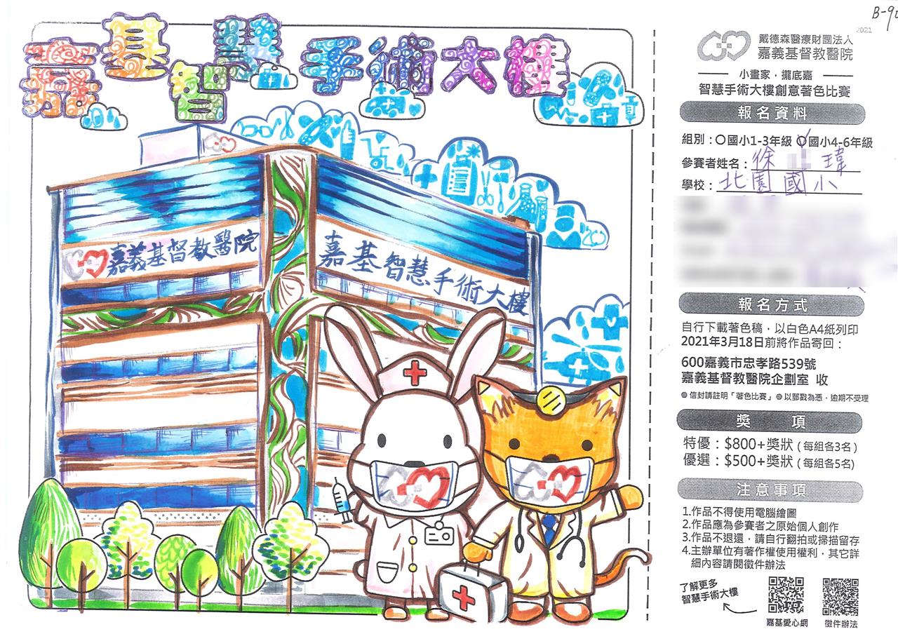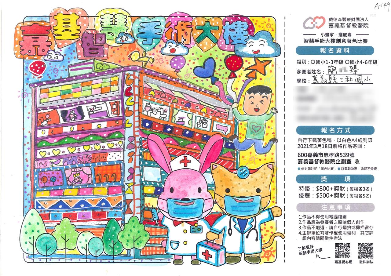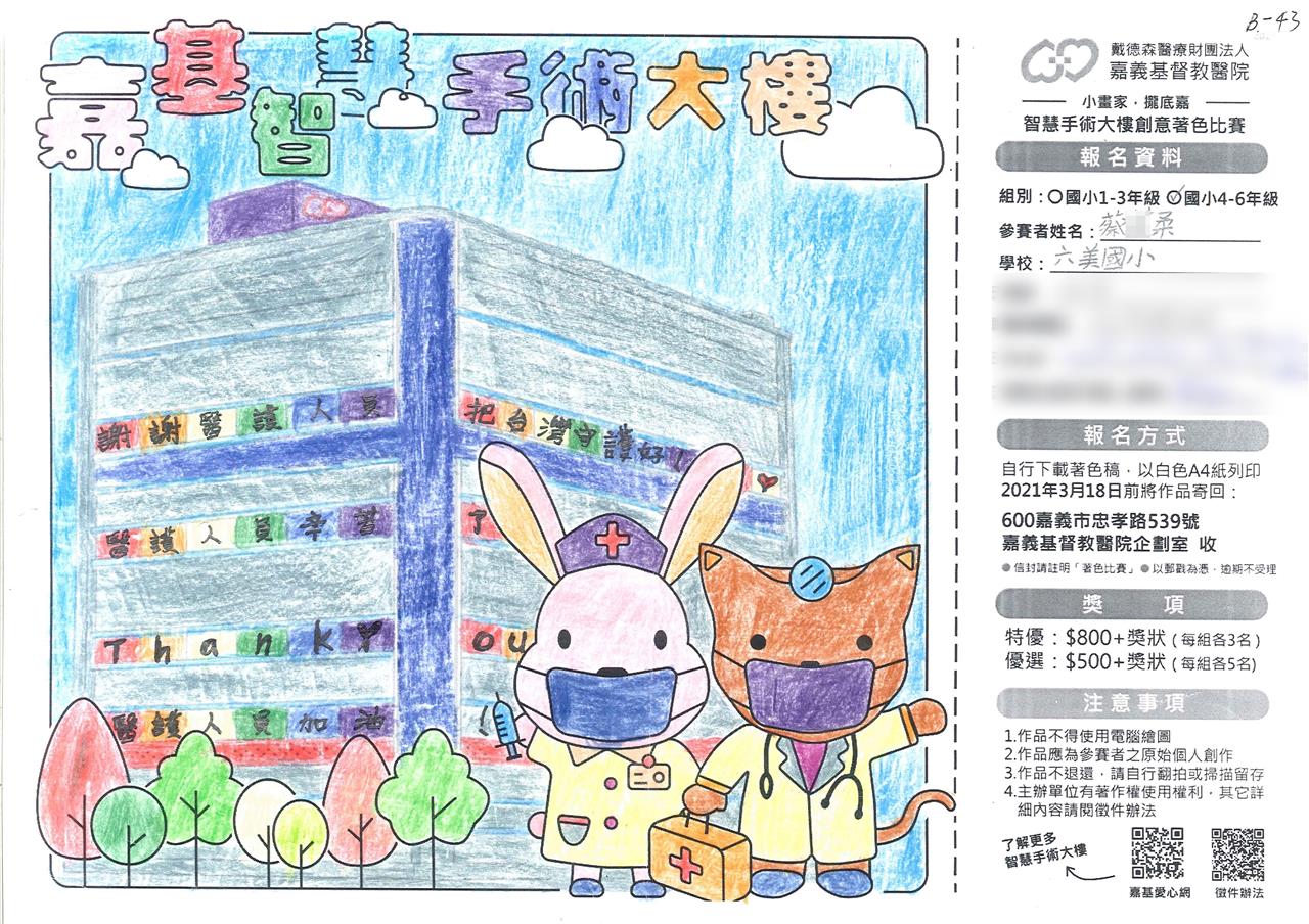 嘉基智慧手術大樓興建,是嘉基及嘉義的重要里程碑,預計引入智慧科技,減少病患及家屬的奔波,守護嘉義所有大朋友、小朋友的健康。透過此著色比賽,希望可以讓嘉義民眾對此大樓有更多認識,並鼓勵幼兒園中班至小學六年級以下的孩童發揮想像力、揮灑創意,為剛硬堅實的建築物增添童趣色彩。